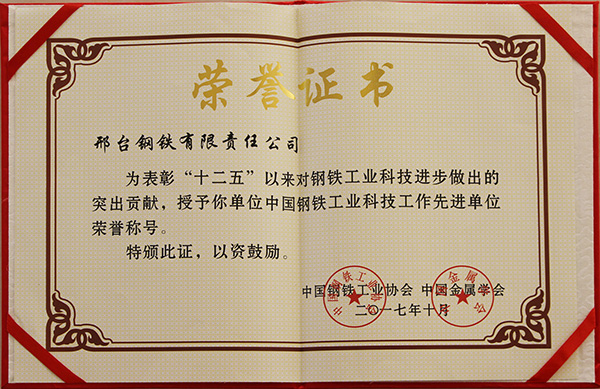 2017年10月,邢鋼被中國鋼鐵工業(yè)協(xié)會和中國金屬學(xué)會聯(lián)合授予“十二五”中國鋼鐵工業(yè)科技工作先進單位榮譽稱號。