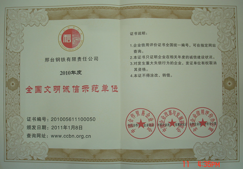 2011年1月,邢鋼榮獲“2010年度全國文明誠信示范單位”稱號。