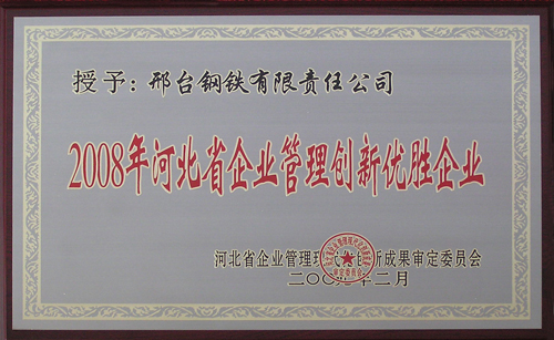 2009年2月,邢鋼榮獲“2008年河北省企業(yè)管理創(chuàng)新優(yōu)勝企業(yè)”榮譽稱號。