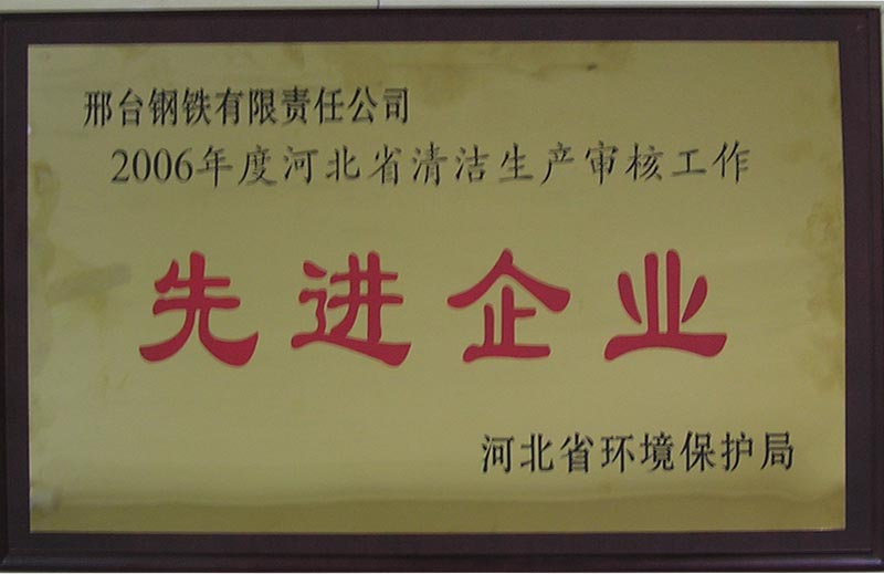 2007年8月,邢鋼榮獲河北省環(huán)保局頒發(fā)的“清潔生產(chǎn)審核先進企業(yè)”榮譽稱號。
