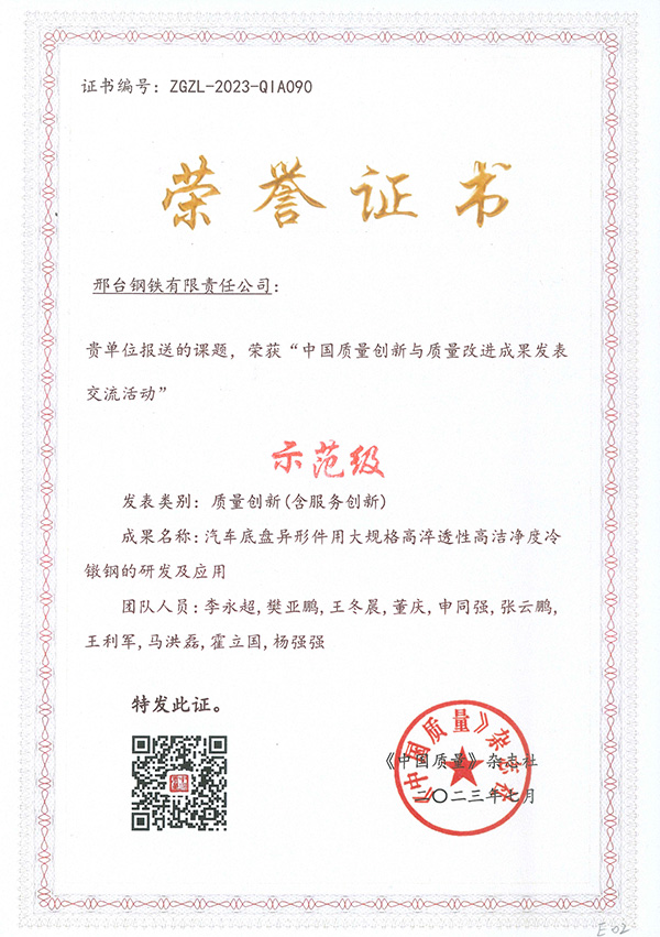 2023年7月,邢臺(tái)鋼鐵有限責(zé)任公司被河北省質(zhì)量文化協(xié)會(huì)評(píng)為“河北省質(zhì)量創(chuàng)新活動(dòng)標(biāo)桿單位”。