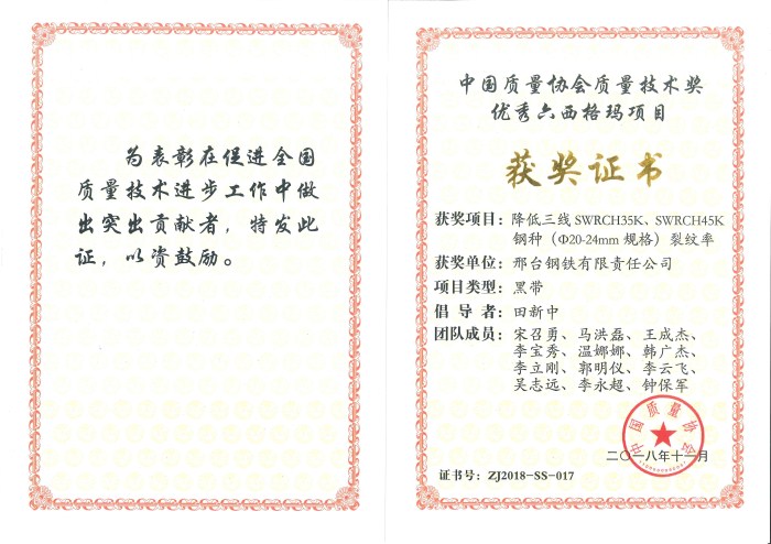 邢鋼榮獲2018年中國質量協會六西格瑪優(yōu)秀項目獎