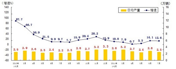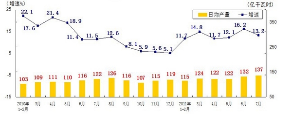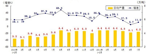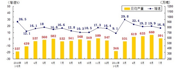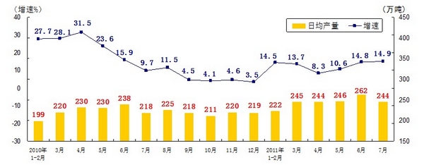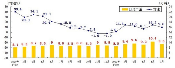 分產(chǎn)品看,7月份,468種產(chǎn)品中有381種產(chǎn)品同比增長(zhǎng)。其中,發(fā)電量4252億千瓦時(shí),日平均發(fā)電量137億千瓦時(shí),增長(zhǎng)13.2%;鋼材7572萬(wàn)噸,日平均產(chǎn)量244萬(wàn)噸,增長(zhǎng)14.9%;水泥18308萬(wàn)噸,日平均產(chǎn)量591萬(wàn)噸,增長(zhǎng)16.8%;原油加工量3749萬(wàn)噸,日平均產(chǎn)量121萬(wàn)噸,增長(zhǎng)5.9%;十種有色金屬293萬(wàn)噸,日平均產(chǎn)量9.5萬(wàn)噸,增長(zhǎng)9.8%;乙烯130萬(wàn)噸,日平均產(chǎn)量4.2萬(wàn)噸,增長(zhǎng)11.5%;汽車(chē)131.8萬(wàn)輛,日平均產(chǎn)量4.3萬(wàn)輛,下降1.3%;轎車(chē)77.7萬(wàn)輛,日平均產(chǎn)量2.5萬(wàn)輛,增長(zhǎng)12.6%。(參見(jiàn)附圖)