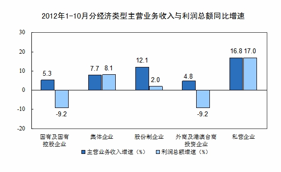 1-10月份,在規(guī)模以上工業(yè)企業(yè)中,國(guó)有及國(guó)有控股企業(yè)實(shí)現(xiàn)利潤(rùn)11270億元,同比下降9.2%;集體企業(yè)實(shí)現(xiàn)利潤(rùn)630億元,同比增長(zhǎng)8.1%;股份制企業(yè)實(shí)現(xiàn)利潤(rùn)23526億元,同比增長(zhǎng)2%;外商及港澳臺(tái)商投資企業(yè)實(shí)現(xiàn)利潤(rùn)9195億元,同比下降9.2%;私營(yíng)企業(yè)實(shí)現(xiàn)利潤(rùn)12623億元,同比增長(zhǎng)17%。