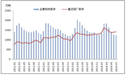 目前,中國鋼材市場正處于去庫存時期,主要鋼材的庫存量正在快速減少。據(jù)我的鋼鐵數(shù)據(jù)庫顯示截止2014年8月8日,中國主要鋼材庫存量為1190.35萬噸,與去年相比下降202萬噸,同比降幅為14.5%。3月至7月的平均降速達(dá)到9.62%,已大幅度超過以往的去庫存速度。庫存量的快速下降,一般意味著下游行業(yè)對鋼材需求的增加,鋼材市場的情況理應(yīng)十分良好,但實(shí)際上鋼材的價格卻是不增反降。據(jù)悉,中國7月的Myspic普鋼絕對價格指數(shù)為3393.54元/噸,同比下降8.56%。