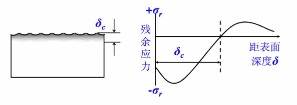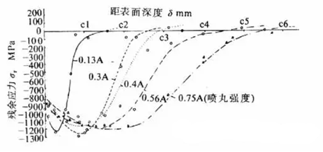噴丸強化影響工件表面深度取決于工作自身強度,工件自身強度越高,影響深度越小。通常影響深度為0.1-0.8mm。下圖是高強鋼(σb=1900MPa)噴丸殘余應(yīng)力分布曲線,圖中可見噴丸強度由0.13Amm增高至0.75Amm,導(dǎo)致δc由0.15mm增至0.55mm,但表面殘余應(yīng)力和最大殘余應(yīng)力變化不明顯。