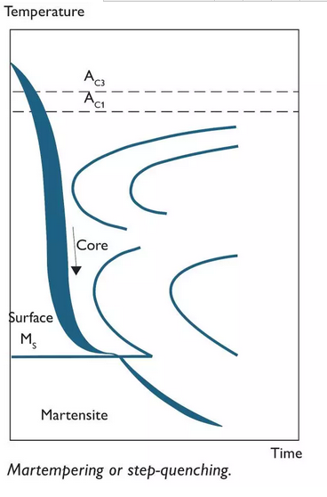 如今,用于合金鋼的淬火介質(zhì)有:硬化油、聚合物溶液、空氣和惰性氣體。空氣硬化保留用于具有高淬透性的鋼,這在大多數(shù)情況下主要?dú)w因于錳、鉻和鉬的組合存在于鋼中。通過(guò)階梯淬火或者分級(jí)淬火可以減少變形和硬化裂紋的風(fēng)險(xiǎn)。在該方法中,材料在兩個(gè)步驟中淬火。首先,將其從硬化溫度冷卻直到表面的溫度剛好高于Ms溫度。然后必須保溫在那里直到表面和芯之間的溫度均衡。此后,冷卻過(guò)程繼續(xù)。這種方法允許芯和表面幾乎同時(shí)轉(zhuǎn)變成馬氏體并減少熱應(yīng)力。當(dāng)在真空爐中淬火時(shí),階梯淬火也是可能的。