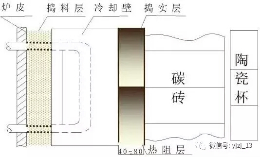 高爐爐缸由外至內(nèi)通常包括爐皮、搗料層、冷卻壁、搗實層、碳磚、陶瓷杯、黏土磚等,其中,黏土磚在高爐開爐后2個月內(nèi)脫落。高爐正常生產(chǎn)時爐缸鐵水與爐墻陶瓷杯或碳磚之間生成一層爐渣、鐵水、碳磚、含鈦難融物組成的保護(hù)層,這就是我們所說的“高爐爐缸自保護(hù)層”。