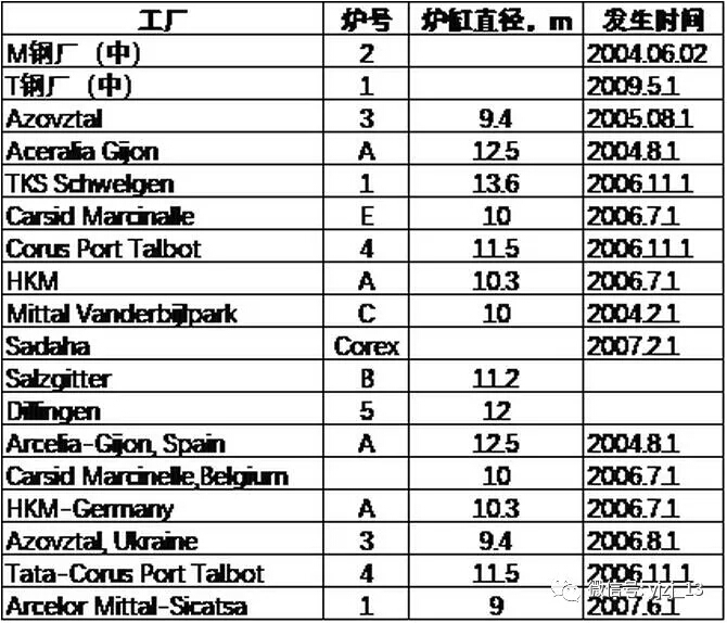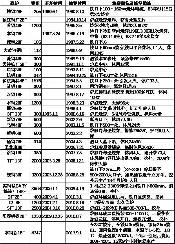 以下針對國內(nèi)外典型高爐爐缸燒出案例進(jìn)行統(tǒng)計,并對燒出原因、修復(fù)和維護(hù)等方面進(jìn)行詳細(xì)的說明,為國內(nèi)外高爐的長壽提供技術(shù)和數(shù)據(jù)參考。