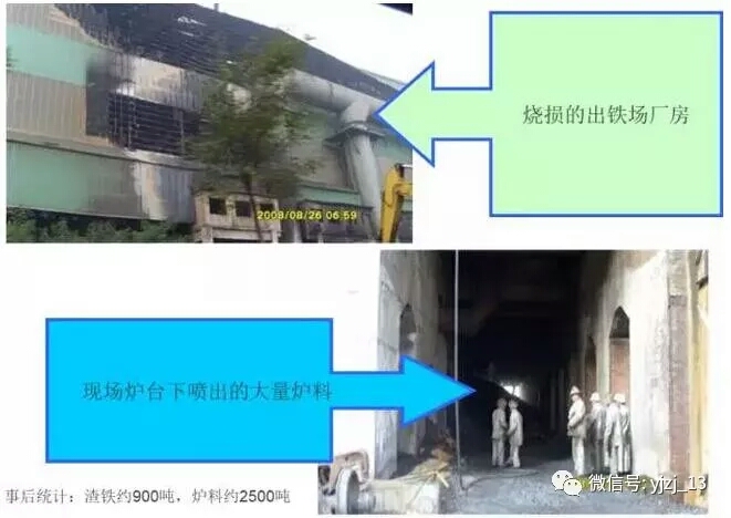 事后確認(rèn):4#鐵口下方爐缸燒穿,大量渣鐵和炙熱的爐料(焦炭、礦石)噴出,現(xiàn)場燒損嚴(yán)重(新3高爐本體電纜、煤粉噴吹總線電纜、新2高爐電源電纜、計量儀表電纜、出鐵場天棚、4#爐前炮、開口機(jī)、東場及北場爐前吊車、爐前休息室、電梯等燒損。)