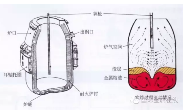 爐料通常為鐵水、廢鋼和造渣材料;也可加入少量冷生鐵和鐵礦石。通過(guò)氧槍從熔池上面向下吹入高壓的純氧(含O299.5%以上),氧化去除鐵水中的硅、錳、碳和磷等元素,并通過(guò)造渣進(jìn)行脫磷和脫硫。各種元素氧化所產(chǎn)生的熱量,加熱了熔池的液態(tài)金屬,使鋼水達(dá)到現(xiàn)定的化學(xué)成分和溫度。它主要用于冶煉非合金鋼和低合金鋼;但通過(guò)精煉手段,也可用于冶煉不銹鋼等合金鋼。