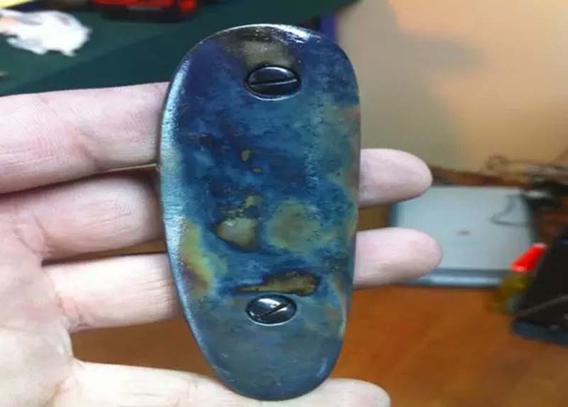 發(fā)藍(或烤藍)借助化學方式來完成:有熱、冷、熏、銹等方式,早期的槍支發(fā)藍處理采用銹發(fā)藍,這個過程是用酸溶液涂覆槍管部件,讓零件均勻生銹,然后將銹蝕處理(擦洗)掉,留下深藍色的表面。此工藝經(jīng)常需要幾天時間完成,而且是非常勞動密集型的,現(xiàn)已被主要槍械制造商放棄。