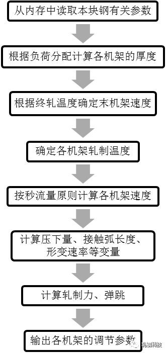 圖1所示為精軋?jiān)O(shè)定模型計(jì)算原理圖的主要思路,不代表編寫程序所用的細(xì)框圖,因此只是展現(xiàn)了大概的計(jì)算流程,看圖可以初步了解精軋?jiān)O(shè)定模型的大致控制思路。