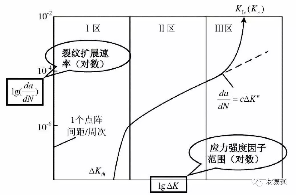 II區(qū):裂紋擴展主要階段,10-5~10-2mm/周次,da/dN~△K呈冪函數(shù)關(guān)系,△K變化范圍很大,擴展壽命長。