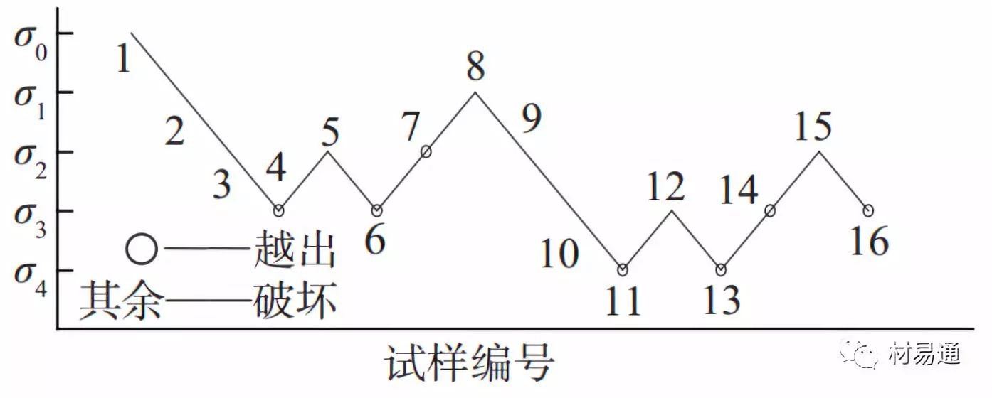 試驗方法:(1)試驗從高于疲勞強度的應(yīng)力水平開始,然后逐級降低(如疲勞強度未知,可選用材料的靜態(tài)拉伸屈服強度Rp0.2或ReL);(2)在應(yīng)力水平下進行第一根試驗,如果在指定壽命N=107次之前發(fā)生破壞,則下一根試樣就要在低一級的應(yīng)力水平下進行,反之,則要在高一級的應(yīng)力水平下進行,直至完成全部試樣;(3)各級應(yīng)力水平之差叫做“應(yīng)力增量”,在整個試驗過程中,應(yīng)力增量應(yīng)保持不變。