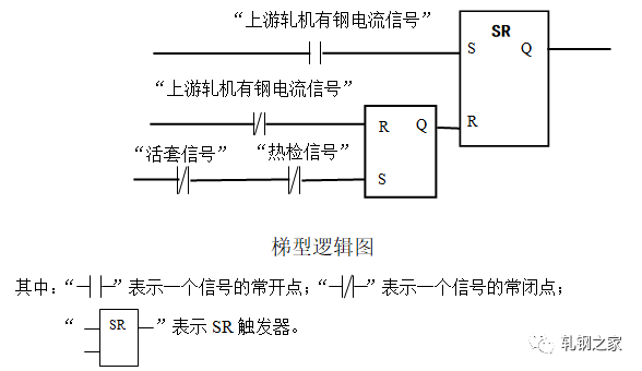在軋件頭部進(jìn)入活套后面軋機(jī)前不允許起套輥升起;在軋件頭部進(jìn)入活套后面軋機(jī)后起套輥必須立即升起。當(dāng)軋件尾部離開活套前面軋件時(shí),起套輥必須立即下降。為了準(zhǔn)確地起落套,我們首先,在活套的起落套的邏輯控制程序中設(shè)置了RS觸發(fā)器。只要下游機(jī)架“有鋼”活套就不能再次起落套。編程如下(梯型邏輯圖):其次,在起套和落套的處理上對(duì)延時(shí)時(shí)間采用了長(zhǎng)度系數(shù)補(bǔ)償?shù)乃惴?,即在?jì)算定時(shí)器的延時(shí)時(shí)間過(guò)程中將線材要走的長(zhǎng)度(如兩機(jī)架間的距離)乘以一個(gè)百分比。這樣就可以:一、消除由于CPU軟件系統(tǒng)本身運(yùn)行周期過(guò)長(zhǎng)造成的定時(shí)計(jì)算誤差;二、靈活地適應(yīng)電氣開關(guān)和機(jī)械上氣閥等的動(dòng)作滯后的不一致性,以使起套輥能較準(zhǔn)確地升起和落下。