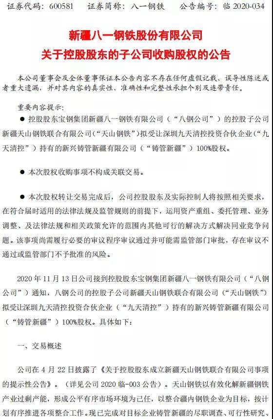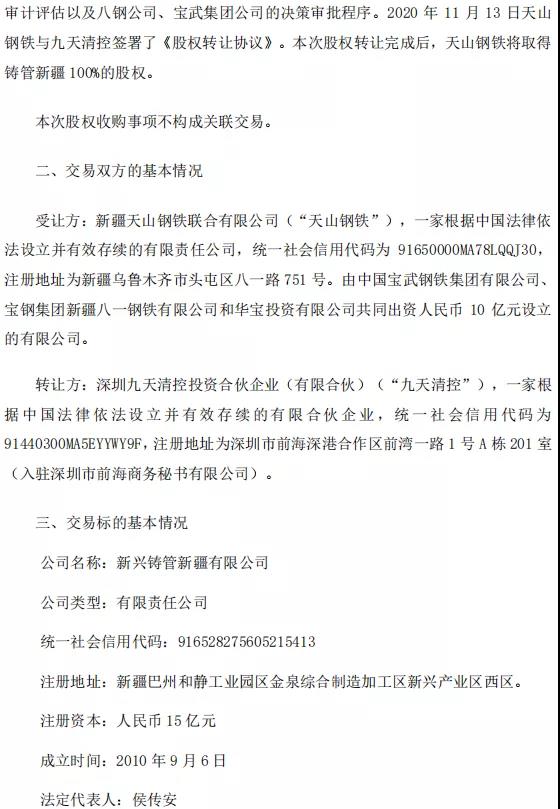 11月13日晚間,八一鋼鐵發(fā)布公告稱(chēng),該公司控股股東寶鋼集團(tuán)新疆八一鋼鐵有限公司的控股子公司新疆天山鋼鐵聯(lián)合有限公司擬受讓深圳九天清控投資合伙企業(yè)持有的新興鑄管新疆有限公司100%股權(quán)。11月13日,天山鋼鐵與九天清控簽署了《股權(quán)轉(zhuǎn)讓協(xié)議》。本次股權(quán)轉(zhuǎn)讓以2019年12月31日為基準(zhǔn)日,以公司經(jīng)天健會(huì)計(jì)師事務(wù)所審計(jì)、北京中企華資產(chǎn)評(píng)估有限責(zé)任公司評(píng)估后的100%股權(quán)價(jià)值為基礎(chǔ),各方協(xié)商確定本次股權(quán)轉(zhuǎn)讓價(jià)款為21.81億元。