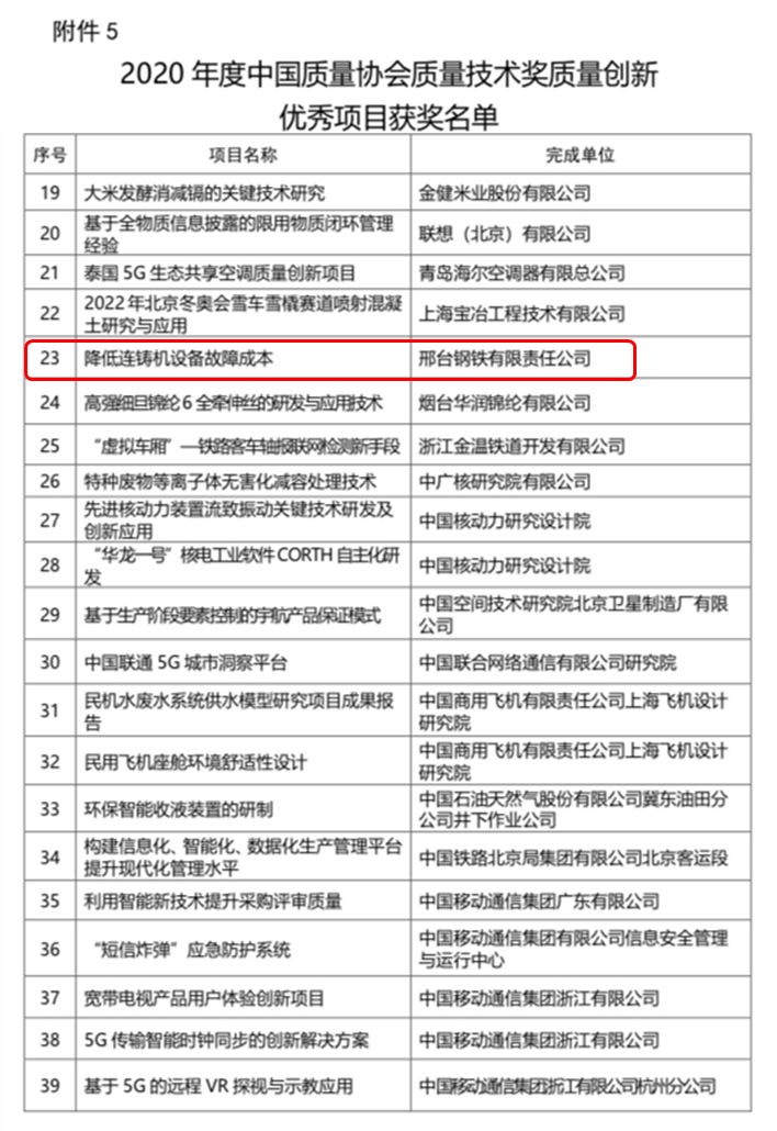 本次評(píng)選是為深入落實(shí)新時(shí)代高質(zhì)量發(fā)展要求,推動(dòng)我國(guó)質(zhì)量技術(shù)進(jìn)步,提高質(zhì)量創(chuàng)新和競(jìng)爭(zhēng)能力,根據(jù)《國(guó)家科學(xué)技術(shù)獎(jiǎng)勵(lì)條例》和《中國(guó)質(zhì)量協(xié)會(huì)質(zhì)量技術(shù)獎(jiǎng)管理辦法》有關(guān)規(guī)定,結(jié)合2020年度中國(guó)質(zhì)量協(xié)會(huì)技術(shù)獎(jiǎng)(以下簡(jiǎn)稱質(zhì)量技術(shù)獎(jiǎng))單列優(yōu)秀項(xiàng)目成果申報(bào)情況,經(jīng)質(zhì)量技術(shù)獎(jiǎng)評(píng)審委員會(huì)評(píng)審,中國(guó)質(zhì)量協(xié)會(huì)批準(zhǔn)授予的。邢鋼公司獲獎(jiǎng)項(xiàng)目—《降低連鑄機(jī)設(shè)備故障成本》為質(zhì)量創(chuàng)新類別單列優(yōu)秀項(xiàng)目成果。