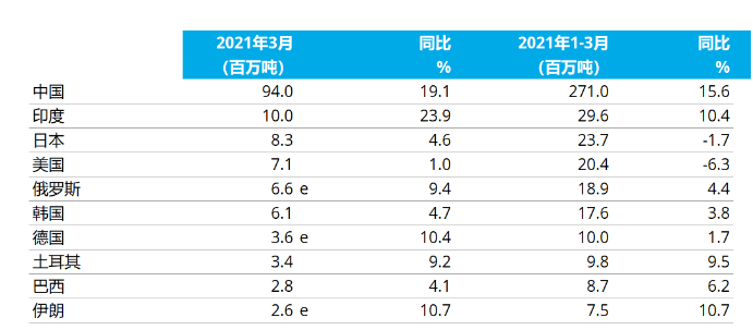 2021年3月,中國(guó)粗鋼產(chǎn)量為9400萬(wàn)噸,同比提高19.1%;