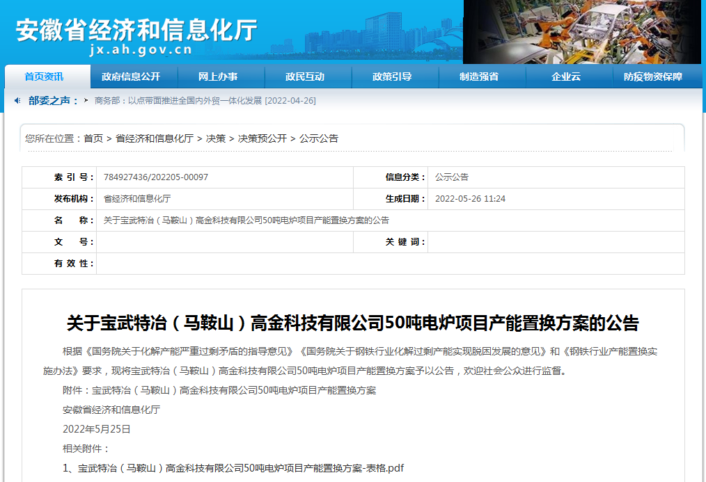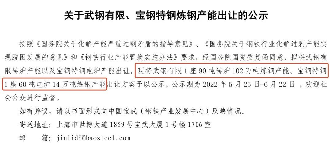 按照《國(guó)務(wù)院關(guān)于化解產(chǎn)能嚴(yán)重過剩矛盾的指導(dǎo)意見》、《國(guó)務(wù)院關(guān)于鋼鐵行業(yè)化解過剩產(chǎn)能實(shí)現(xiàn)脫困發(fā)展的意見》和《鋼鐵行業(yè)產(chǎn)能置換實(shí)施辦法》要求,經(jīng)國(guó)務(wù)院國(guó)資委復(fù)函同意,擬將武鋼有限轉(zhuǎn)爐產(chǎn)能以及寶鋼特鋼電爐產(chǎn)能出讓。現(xiàn)將武鋼有限1座90噸轉(zhuǎn)爐102萬噸煉鋼產(chǎn)能、寶鋼特鋼1座60噸電爐14萬噸煉鋼產(chǎn)能出讓方案予以公示,公示期為2022年5月25日-6月22日,歡迎社會(huì)公眾進(jìn)行監(jiān)督。