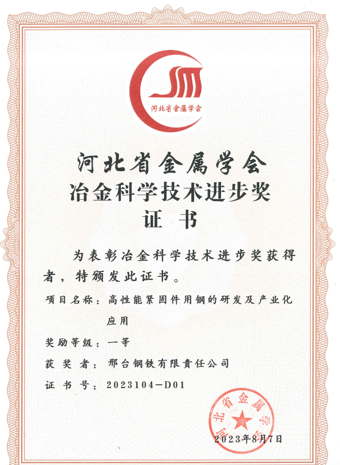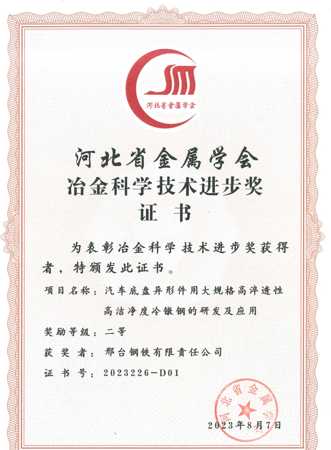 近日,邢臺(tái)鋼鐵有限責(zé)任公司兩項(xiàng)科技研發(fā)項(xiàng)目“高性能緊固件用鋼的研發(fā)及產(chǎn)業(yè)化應(yīng)用項(xiàng)目”“汽車底盤異形件用大規(guī)格高淬透性高潔凈度冷鐓鋼的研發(fā)及應(yīng)用”得到河北省金屬學(xué)會(huì)專家評(píng)審委員會(huì)的高度認(rèn)可,分別榮獲2023年度的 “河北冶金科學(xué)技術(shù)獎(jiǎng)”一、二等獎(jiǎng)。