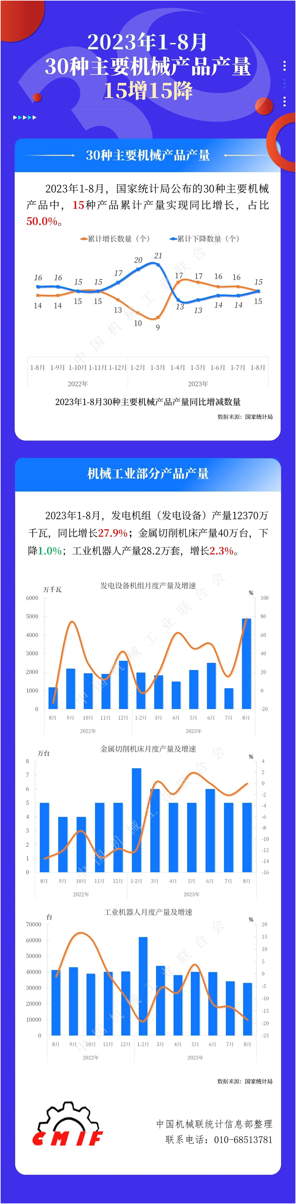 2023年1-8月,國家統(tǒng)計局公布的30種主要機械產品中,15種產品累計產量實現(xiàn)同比增長,占比50.0%。