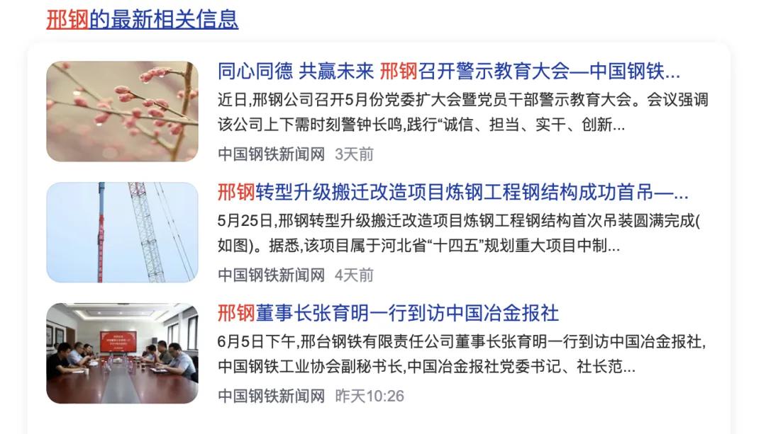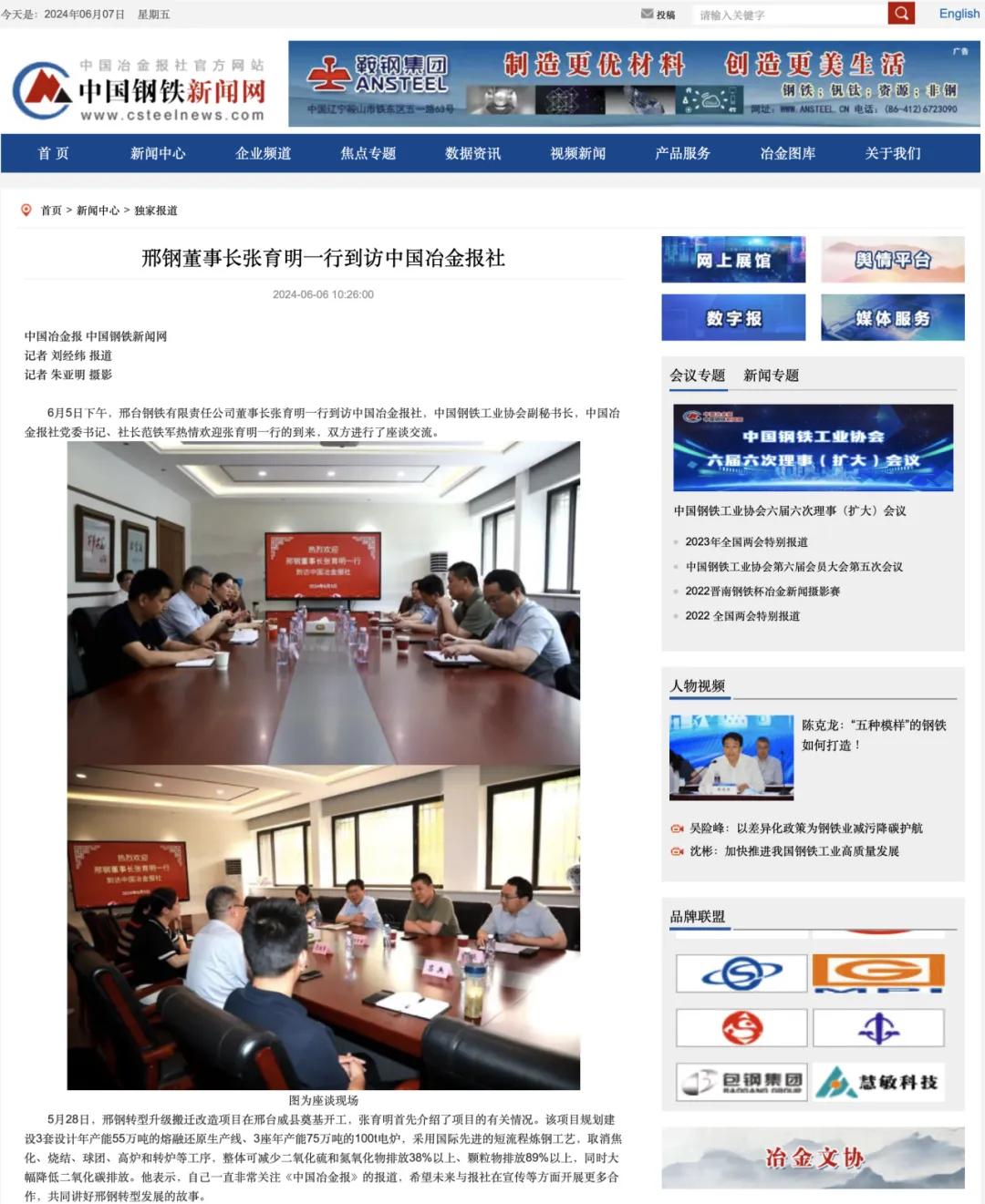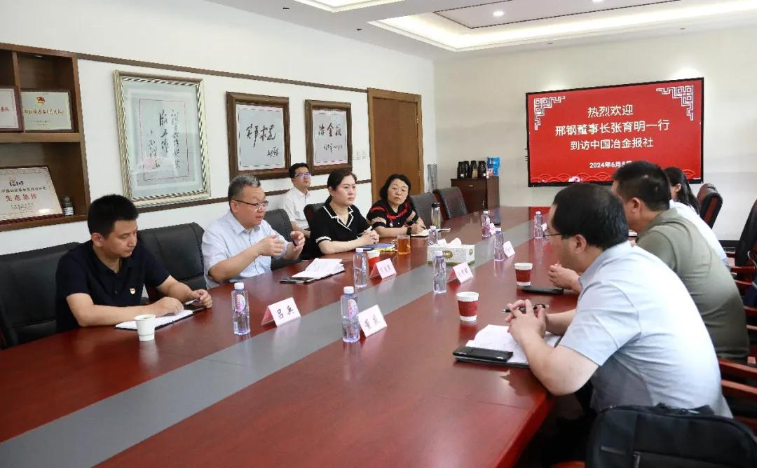 6月5日下午,邢臺鋼鐵有限責(zé)任公司董事長張育明一行到訪中國冶金報社,中國鋼鐵工業(yè)協(xié)會副秘書長,中國冶金報社黨委書記、社長范鐵軍熱情歡迎張育明一行的到來,雙方進(jìn)行了座談交流。