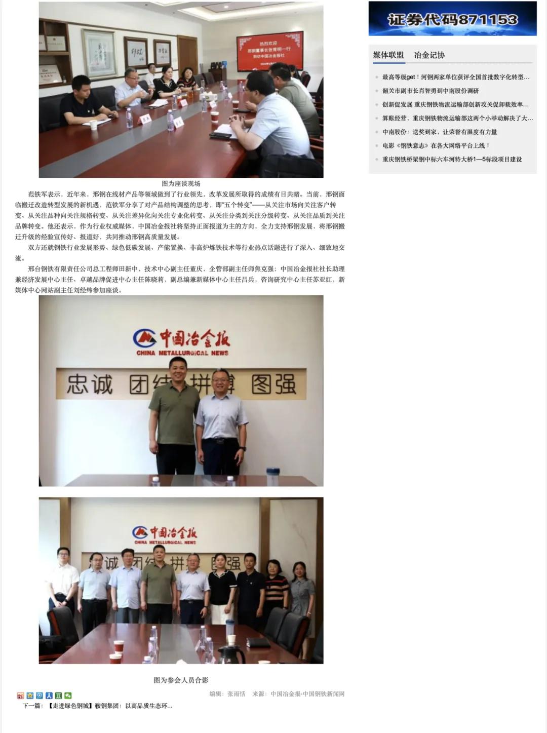 邢臺鋼鐵有限責(zé)任公司總工程師田新中,技術(shù)中心副主任董慶,企管部副主任師焦克強(qiáng);中國冶金報社社長助理兼經(jīng)濟(jì)發(fā)展中心主任、卓越品牌促進(jìn)中心主任陳曉莉,副總編兼新媒體中心主任呂兵,咨詢研究中心主任蘇亞紅,新媒體中心網(wǎng)站副主任劉經(jīng)緯參加座談。