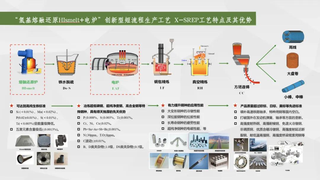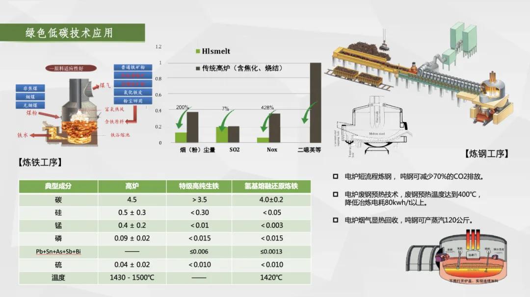 一是布局“碳達峰、碳中和”,實現(xiàn)綠色化,引領品牌可持續(xù)發(fā)展。采用的“熔融還原+電爐煉鋼”短流程工藝,取消了燒結、球團、焦化、預還原等工藝環(huán)節(jié),為世界首創(chuàng);和長流程工藝相比,預計可減少二氧化硫、氮氧化物排放38%,減少顆粒物排放89%,建廠即達到A級企業(yè)標準,實現(xiàn)綠色冶金,對我國乃至世界鋼鐵行業(yè)發(fā)展具有創(chuàng)新性和引領示范的意義,是鋼鐵行業(yè)綠色轉(zhuǎn)型的典范。