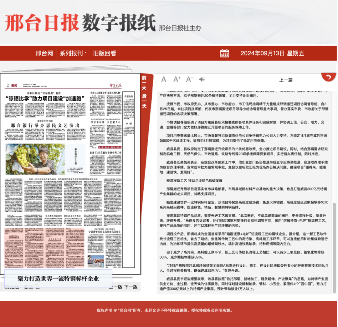邢鋼搬遷升級項(xiàng)目是落實(shí)省市戰(zhàn)略部署,布局縣域新材料產(chǎn)業(yè)基地的重大決策,也是打造威縣300億元特鋼產(chǎn)業(yè)集群的龍頭項(xiàng)目、戰(zhàn)略支撐項(xiàng)目。 瞄準(zhǔn)建設(shè)世界一流特鋼標(biāo)桿企業(yè),該項(xiàng)目將聚焦高強(qiáng)度耐熱鋼、免退火冷鐓鋼、高強(qiáng)度耐延遲斷裂鋼等10大系列高精尖鋼種,塑造綠色、精品、智慧的特鋼品牌。