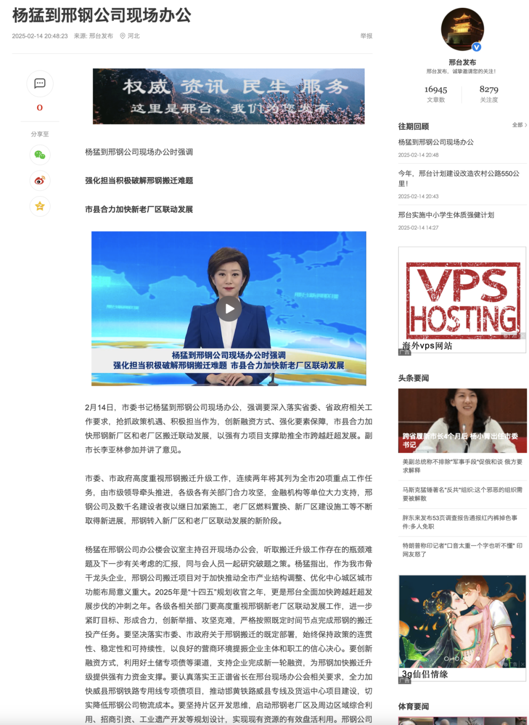 2月14日,市委書記楊猛到邢鋼公司現(xiàn)場辦公,強調(diào)要深入落實省委、省政府相關(guān)工作要求,搶抓政策機遇、積極擔(dān)當作為,創(chuàng)新融資方式、強化要素保障,市縣合力加快邢鋼新廠區(qū)和老廠區(qū)搬遷聯(lián)動發(fā)展,以強有力項目支撐助推全市跨越趕超發(fā)展。副市長李亞林參加并講了意見。