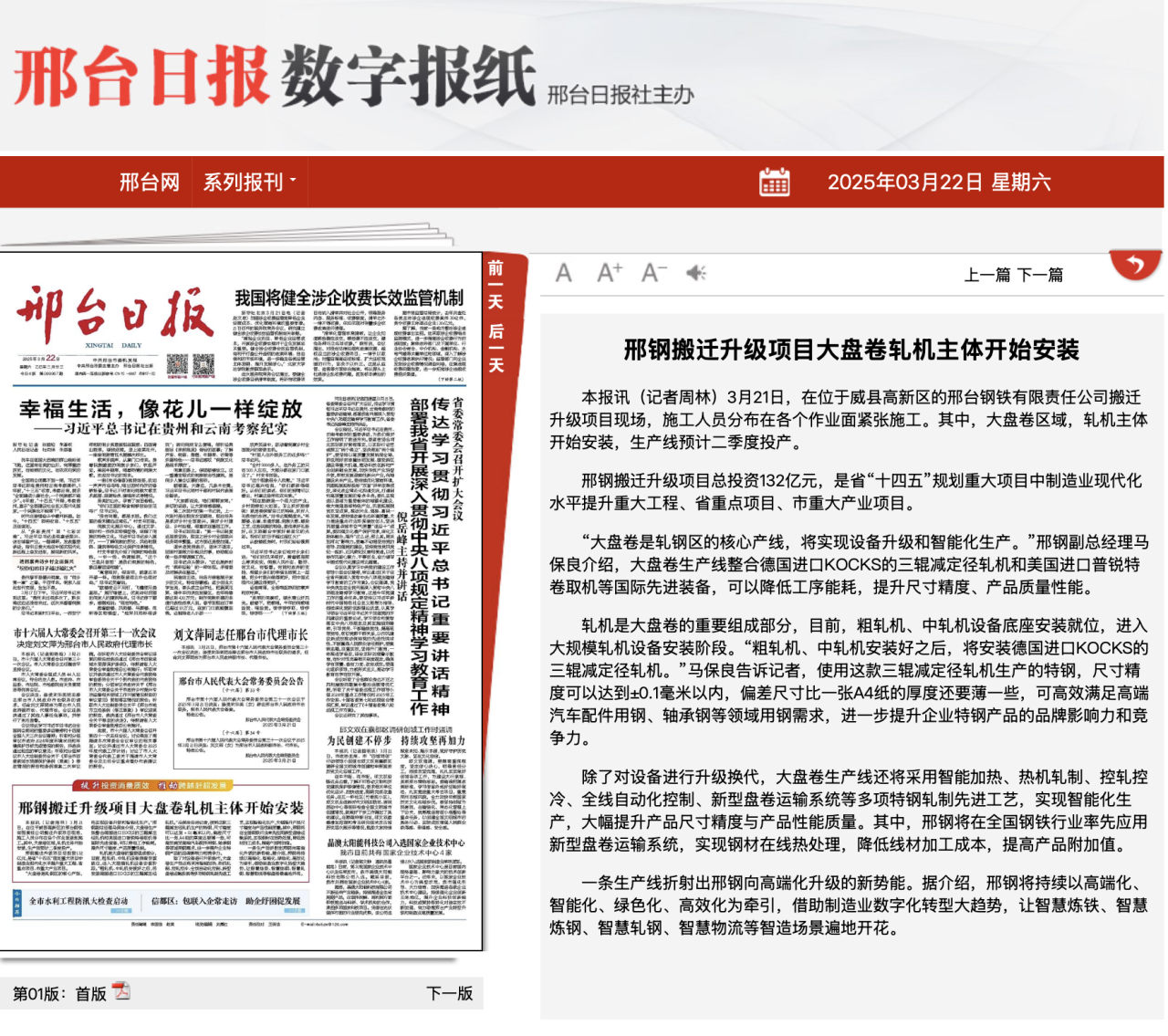 3月21日,在位于威縣高新區(qū)的邢臺鋼鐵有限責(zé)任公司搬遷升級項(xiàng)目現(xiàn)場,施工人員分布在各個(gè)作業(yè)面緊張施工。其中,大盤卷區(qū)域,軋機(jī)主體開始安裝,生產(chǎn)線預(yù)計(jì)二季度投產(chǎn)。
