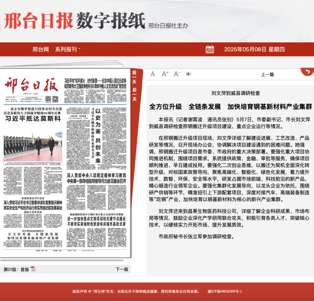 本報訊(記者謝霄凌 通訊員張釗)5月7日,市委副書記、市長劉文萍到威縣調研檢查邢鋼搬遷升級項目建設、重點企業(yè)運行等情況。