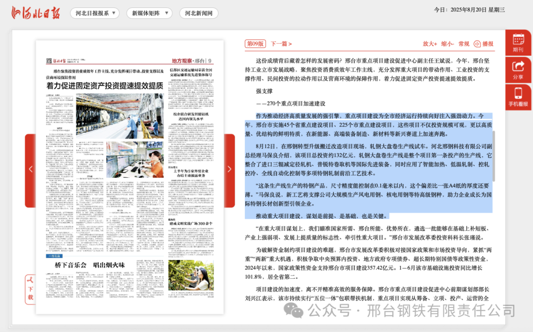 8月12日,在邢鋼轉(zhuǎn)型升級搬遷改造項(xiàng)目現(xiàn)場,軋鋼大盤卷生產(chǎn)線試車。河北邢鋼科技有限公司副總經(jīng)理馬保良介紹,該項(xiàng)目總投資約132億元,軋鋼大盤卷生產(chǎn)線是整個(gè)項(xiàng)目第一條投產(chǎn)的生產(chǎn)線,它整合了進(jìn)口三輥減定徑軋機(jī)、普銳特卷取機(jī)等國際先進(jìn)裝備,同時(shí)應(yīng)用了智能加熱、低溫軋制、控軋控冷、全線自動(dòng)化控制等多項(xiàng)特鋼軋制前沿工藝技術(shù)。“這條生產(chǎn)線生產(chǎn)的特鋼產(chǎn)品,尺寸精度能控制在0.1毫米以內(nèi),這個(gè)偏差比一張A4紙的厚度還要薄。”馬保良說,新工藝將支撐公司大規(guī)模生產(chǎn)風(fēng)電用鋼、核電用鋼等特高級鋼種,助力企業(yè)成長為國際特鋼長材創(chuàng)新型引領(lǐng)企業(yè)。