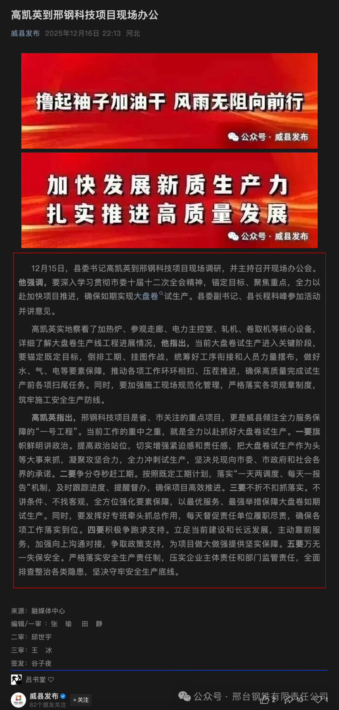 高凱英指出,邢鋼科技項(xiàng)目是省、市關(guān)注的重點(diǎn)項(xiàng)目,更是威縣傾注全力服務(wù)保障的“一號(hào)工程”。當(dāng)前工作的重中之重,就是全力以赴抓好大盤卷試生產(chǎn)。一要旗幟鮮明講政治。提高政治站位,切實(shí)增強(qiáng)緊迫感和責(zé)任感,把大盤卷試生產(chǎn)作為頭等大事來抓,凝聚攻堅(jiān)合力,全力沖刺試生產(chǎn),堅(jiān)決兌現(xiàn)向市委、市政府和社會(huì)各界的承諾。二要爭(zhēng)分奪秒趕工期。按照既定工期計(jì)劃,落實(shí)“一天兩調(diào)度、每天一報(bào)告”機(jī)制,及時(shí)跟蹤進(jìn)度、提醒督辦,確保項(xiàng)目高效推進(jìn)。三要不折不扣抓落實(shí)。不講條件、不找客觀,全方位強(qiáng)化要素保障,以最優(yōu)服務(wù)、最強(qiáng)舉措保障大盤卷如期試生產(chǎn)。同時(shí),要發(fā)揮好專班牽頭抓總作用,每天督促責(zé)任單位履職盡責(zé),確保各項(xiàng)工作落實(shí)到位。四要積極爭(zhēng)跑求支持。立足當(dāng)前建設(shè)和長(zhǎng)遠(yuǎn)發(fā)展,主動(dòng)靠前服務(wù),加強(qiáng)向上溝通對(duì)接,爭(zhēng)取政策支持,為項(xiàng)目做大做強(qiáng)提供堅(jiān)實(shí)保障。五要萬無一失保安全。嚴(yán)格落實(shí)安全生產(chǎn)責(zé)任制,壓實(shí)企業(yè)主體責(zé)任和部門監(jiān)管責(zé)任,全面排查整治各類隱患,堅(jiān)決守牢安全生產(chǎn)底線。