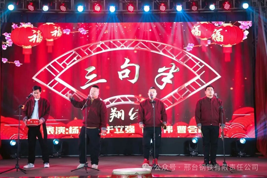 煉鋼廠、線材廠、煉鐵廠、新翔公司等二級(jí)單位、子公司錄制了《邢鋼職工賀新春》視頻,祝福邢鋼,喜迎新春,為聯(lián)歡會(huì)烘托出濃厚的節(jié)日氣氛。煉鋼廠張康建等一曲《你盡管盛開》讓觀眾感受到了春天的腳步,新翔公司曹會(huì)拴等表演的三句半《新翔戰(zhàn)鼓,奮進(jìn)新程》展現(xiàn)了邢鋼人樂觀、自信、拼搏的精神風(fēng)貌;能源動(dòng)力部王建軍的《就戀這把土》,碳資產(chǎn)管理部蘆麗華的《世界贈(zèng)予我的》,線材廠魏東等的《往事如煙》、《正義之道》,退休職工申學(xué)軍的《戲曲串燒》,或熾熱張揚(yáng),或深情款款,或戲韻醇厚,展現(xiàn)了邢鋼職工的別樣精彩;銷售公司張可等的舞蹈《上春山》,旋律歡快,舞步輕盈,讓整個(gè)舞臺(tái)春意盎然;煉鐵廠劉世沛、毛恒等的小品《考察》,現(xiàn)場(chǎng)“笑”果滿滿,在輕松、詼諧的表演中,展示了廣大員工對(duì)新邢鋼美好未來的信心。邢鋼搬遷項(xiàng)目指揮部邢闊君、王綿等的詩(shī)朗誦《鋼鐵鑄新程,奮進(jìn)向未來》,以新邢鋼建設(shè)者的身份,青春激揚(yáng),誓言錚錚,抒發(fā)在新邢鋼追求夢(mèng)想、實(shí)現(xiàn)人生價(jià)值的滿腔赤誠(chéng)。聯(lián)歡會(huì)穿插了現(xiàn)場(chǎng)幸運(yùn)觀眾抽獎(jiǎng)的環(huán)節(jié),收到新春禮品的觀眾喜笑顏開。